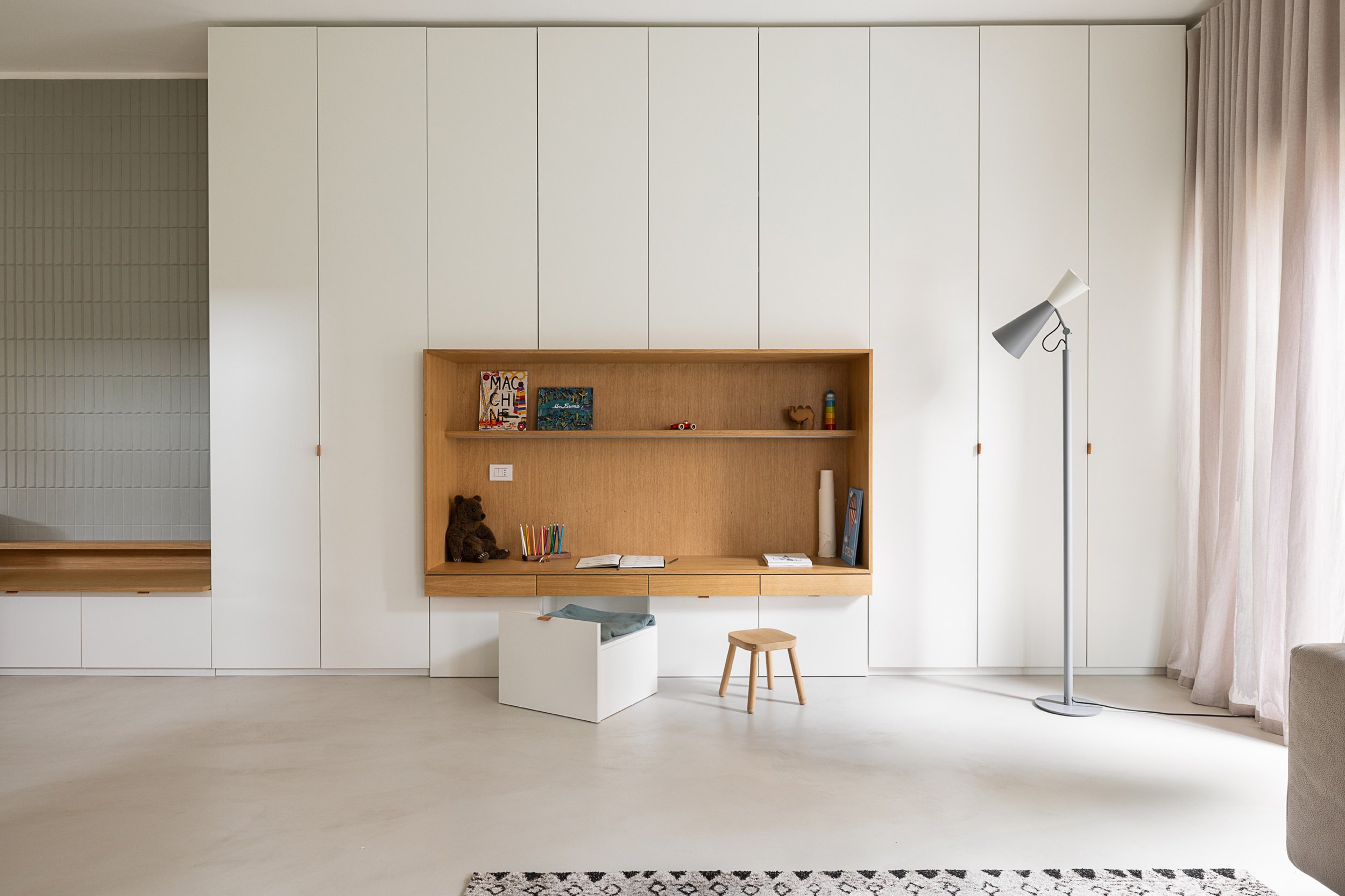 Il ritmo delle scaglie geometriche del gres di rivestimento a parete, sembrano onde che si infrangano sulla superficie. Tutto attorno un mobile su misura che da armadio di ingresso si trasforma in panca contenitiva per il pranzo per poi tornare armadio con una "nicchia laboratorio" pensata per i più piccoli: infatti sotto la nicchia sono collocati degli elementi contenitivi che sono anche sgabelli mobili e che trasformano il piano nella nicchia in un tavolo perfetto per disegnare!